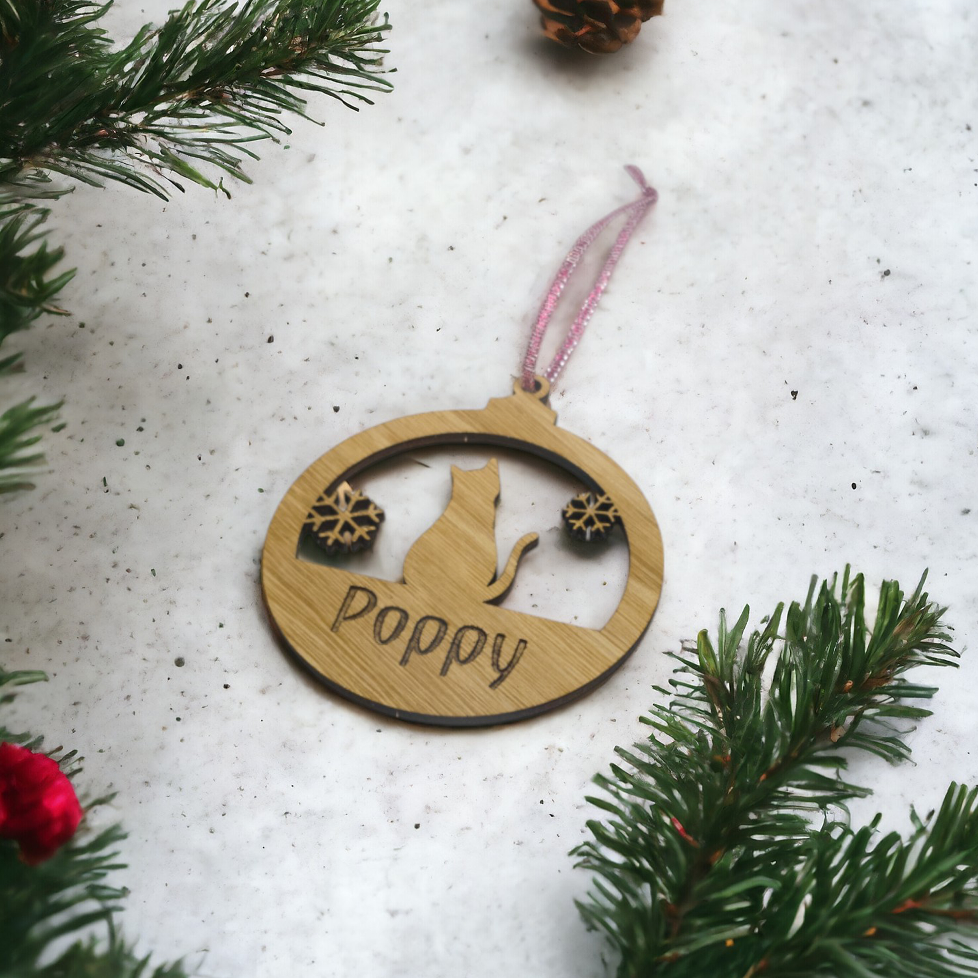 Celebrate the holiday season with a beautifully engraved wooden Christmas bauble, specially designed for your beloved dog, cat, or rabbit! This charming decoration features a custom engraving of your pet’s name and an optional festive design, making it a heart warming keepsake to treasure for years to come. Made from high-quality wood, it's lightweight yet durable, perfect for adding a personal touch to your Christmas tree.
